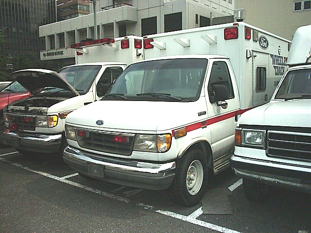 この写真は1999年、私のリンカーンタウンカーの整備でお世話になっていた東京田町に所在していた近鉄モータースのヤードに部品取り車として保管されていたE-350ベースの高規格救急車です。 財産管理はされていましたが金額が合えば登録・売却も可能とのことでした。